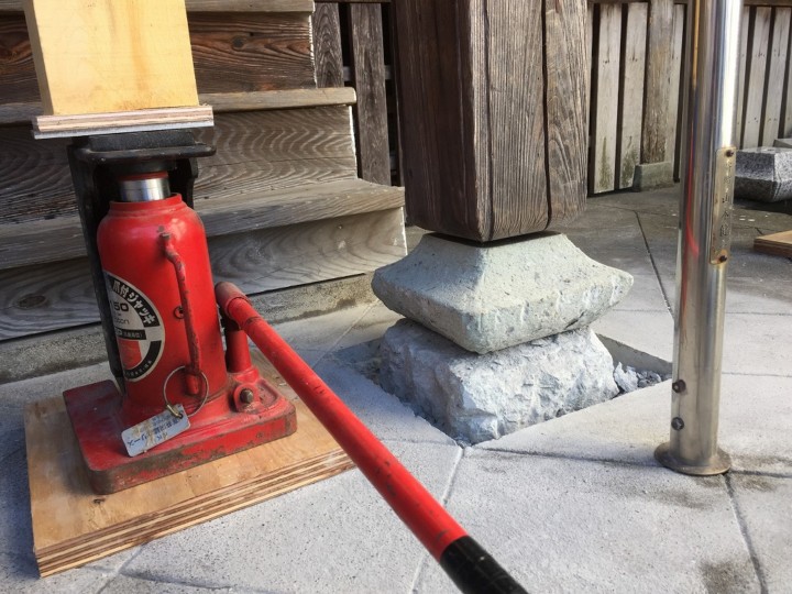 油圧ジャッキにて屋根を浮かせる作業です。